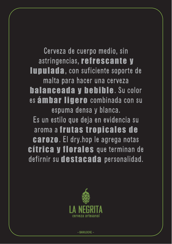 Es una cerveza de cuerpo medio, sin astringencias, refrescante y lupulada, con suficiente soporte de malta para hacer una cerveza balanceada y bebible. Su color es ámbar ligero complementada con su densa espuma blanca. Es un estilo que deja en evidencia su aroma a frutas tropicales de carozo. El dry.hop le agrega notas cítrica y florales que terminan de defirnir su destacada personalidad.