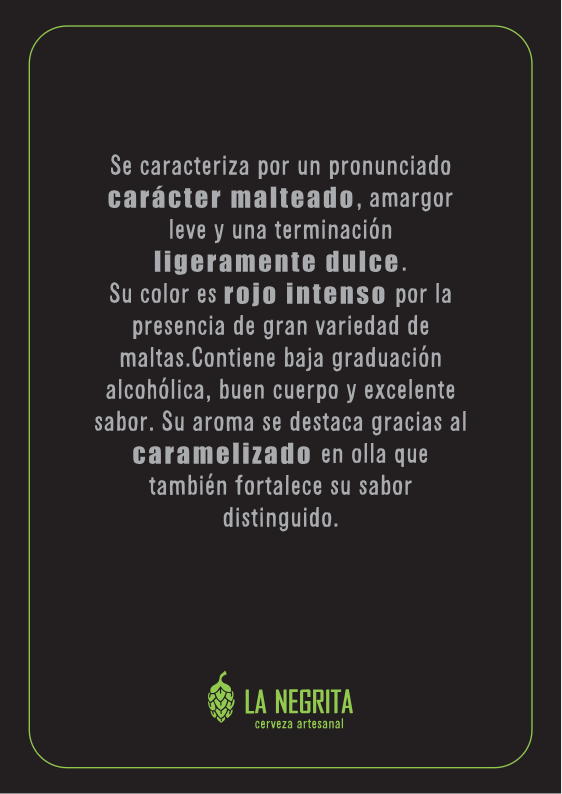 Contiene baja graduación alcohólica, buen cuerpo, excelente sabor y aroma que se destacan gracias al caramelizado en olla. Su color es rojo intenso por la presencia de gran variedad de maltas.